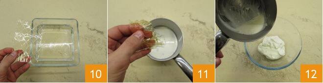 In der Zwischenzeit kümmern Sie sich um die Creme. Lassen Sie den Joghurt etwa zehn Minuten außerhalb des Kühlschranks. Weichen Sie die Gelatine in kaltem Wasser ein 10. In der Zwischenzeit erhitzen Sie 20 g Sahne in einem kleinen Topf, achten Sie darauf, dass sie nicht zu kochen beginnt. Wenn sie temperiert ist, abtropfen lassen und die Gelatine sofort rühren, damit sie sich auflöst 11. Geben Sie die frisch erhaltene Mischung in die Schüssel mit dem Joghurt 12