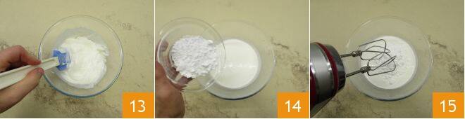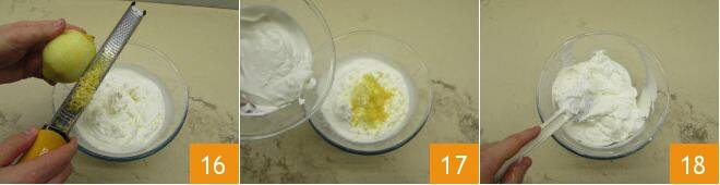 Reiben Sie die Zitronenschale ab 16 und integrieren Sie sie zusammen mit der Joghurtmischung 17 sehr vorsichtig, mit Bewegungen von unten nach oben 18.