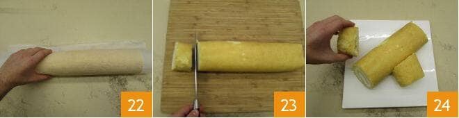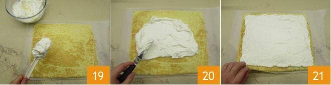 Gleichen Sie den Biskuitteig aus, indem Sie die Ränder abschneiden und ¾ der Creme 19 darauf verteilen, wobei Sie darauf achten, einen Zentimeter von den Rändern freizulassen 20. Beginnen Sie, ihn mit Hilfe des Backpapiers aufzurollen 21.