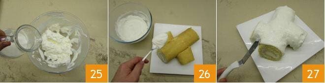 Holen Sie die Creme zurück, verdünnen Sie sie mit ganz wenig Sahne, gerade genug, um sie etwas aufzuweichen 25 und glasieren Sie den Baumstamm 26, achten Sie darauf, nicht den Teil zu bedecken, der wie das Innere des Stammes aussieht 27.