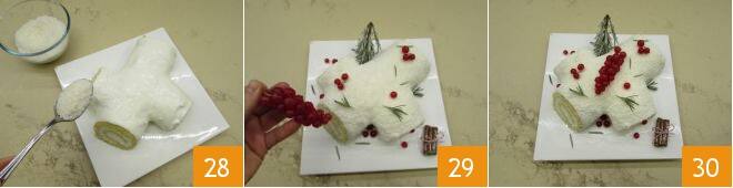 Besprenkeln Sie die Oberfläche mit geriebenem Kokosnuss 28 und stellen Sie ihn noch eine halbe Stunde in den Kühlschrank. Schließlich garnieren Sie mit Johannisbeeren und einigen Rosmarinnadeln 29. Hier ist Ihr verschneiter Weihnachtsbaumstamm bereit: Frohe Weihnachten 30!