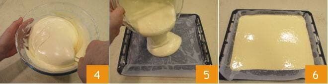mischen Sie mit einem Teigschaber von unten nach oben, um die Mischung zu integrieren, ohne sie zu entlüften 4. Dann gießen Sie den Teig auf ein bereits gebuttertes und mit Backpapier ausgelegtes Backblech von 30x38 cm 5. Glätten Sie es sorgfältig und gehen Sie zum Backen über 6: