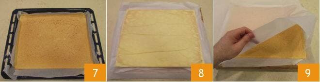 Der Biskuitteig wird in einem vorgeheizten Ofen bei 220°, etwa 8-9 Minuten lang gebacken 7. Wenn er fertig ist, drehen Sie ihn auf ein Backpapier und lassen Sie ihn abkühlen 8, dann reicht es, das Blatt vorsichtig zu entfernen 9.