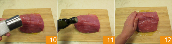 Für das Fleisch nehmen Sie das Stück Kalbsnuss (oder Runde): salzen 10, mit Öl beträufeln 11 und das gesamte Fleischstück massieren 12.