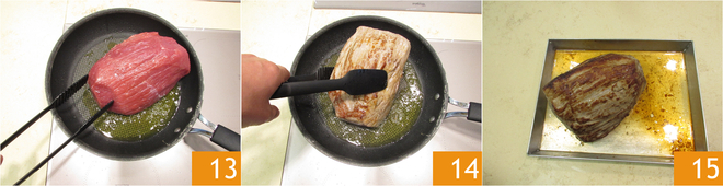 Vor dem Backen im Ofen wird das Fleisch in einer bereits heißen Pfanne mit etwas Öl angebraten, um es zu versiegeln 13 14: Auf diese Weise bleiben die Säfte im Inneren und das Fleisch bleibt auch nach dem Backen im Ofen sehr zart. Anschließend im vorgeheizten Ofen bei 135° (statischer Ofen) für 20-25 Minuten (für das von uns verwendete 1-kg-Stück Fleisch) backen. Die Kerntemperatur sollte bei 59° liegen.