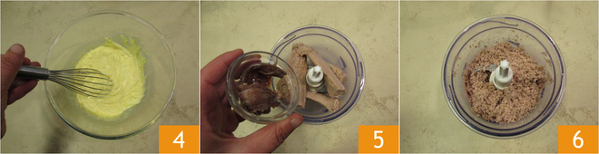 Zum Schluss fügen Sie den Senf hinzu und vermischen Sie mit dem Schneebesen, um eine cremige und homogene Konsistenz zu erhalten 4. Beiseite stellen und mit der Zubereitung der Thunfischsauce fortfahren: Pürieren Sie den abgetropften roten Thunfisch aus Sizilien, die Kantabrischen Sardellen 5, die entsalzten Kapern, bis Sie eine homogene Masse erhalten 6.