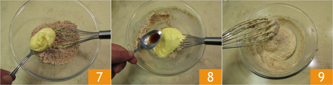 Fügen Sie die Mayonnaise der Masse hinzu 7, dann auch die Worcestersauce 8, mischen Sie, um eine samtige und homogene Sauce zu erhalten 9. Beiseite stellen.