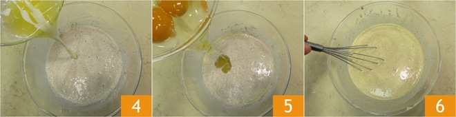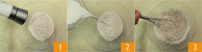 Um die Vollkorn-Crepes mit gemischtem Gemüse und Feta zuzubereiten, schmelzt zunächst die Butter für den Teig und lasst sie abkühlen. Gebt das Vollkornmehl und das Salz in eine Schüssel 1, dann fügt die Milch nach und nach hinzu 2, während ihr mit einem Schneebesen rührt 3.