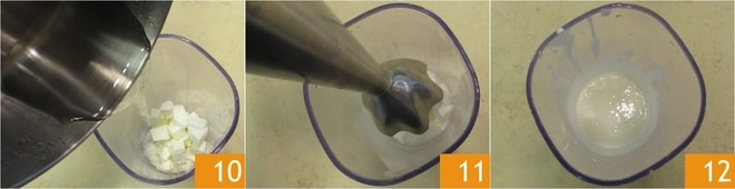 Gebt den Feta in einen hohen, schmalen Behälter, gießt das heiße Wasser hinzu 10 und püriert mit einem Stabmixer 11, um eine glatte und homogene Sauce zu erhalten 12.