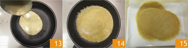 Holt den Teig aus dem Kühlschrank und bratet die Crepes: erhitzt eine antihaftbeschichtete Pfanne mit einem Durchmesser von 20 cm und fettet sie mit wenig Butter ein, dann gießt einen knappen Schöpflöffel Teig in die Mitte 13. Bratet bei mittlerer bis niedriger Hitze etwa 3 Minuten 14, dreht dann die Crepe um und bratet sie auch auf der anderen Seite etwa 2 Minuten. Stapelt die Crepes nach und nach auf einem Tablett 15; wenn ihr sie nicht sofort verwendet, deckt sie mit Frischhaltefolie oder einem Tuch ab, damit sie nicht austrocknen.