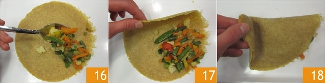 Ihr seid bereit, die Crepes zu füllen: platziert die Füllung auf einem Viertel der Fläche 16, dann faltet sie in der Mitte 17 und schließlich zu einem Dreieck 18. Macht dasselbe, um auch die anderen Crepes zu füllen.
