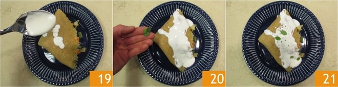 Garniert die Crepes mit der Feta-Sauce 19, etwas Pfeffer und ein paar frischen Oreganoblättern 20. Eure Vollkorn-Crepes mit gemischtem Gemüse und Feta sind servierfertig 21!