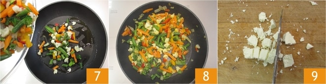 In der Zwischenzeit bereitet die Füllung zu: erhitzt eine antihaftbeschichtete Pfanne mit etwas Öl, gebt das Gemüse hinzu 7 und bratet es bei starker Hitze für 7 Minuten 8, dann salzt es und lasst es abkühlen. Schneidet nun den Feta in Würfel 9 und erhitzt das Wasser auf etwa 70°.