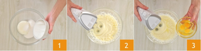 Um den Vollkornkuchen zuzubereiten, beginnen Sie mit dem Teig. Nehmen Sie den Ricotta und geben Sie ihn zusammen mit dem Kristallzucker in eine Schüssel 1, beginnen Sie mit einem Mixer zu verrühren, bis Sie eine homogene Creme erhalten 2, dann fügen Sie die Eier nacheinander hinzu 3.