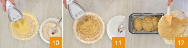 Arbeiten Sie weiter mit dem Handmixer und beginnen Sie, während er in Aktion ist, nach und nach das Vollkornmehl hinzuzufügen 10 11. Rühren Sie etwa ein paar Minuten, bis Sie einen homogenen Teig erhalten. Geben Sie den Teig in eine mit Backpapier ausgelegte Kastenform von 14x24 cm 12.