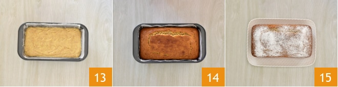Glätten Sie die Oberfläche vorsichtig 13 und backen Sie im vorgeheizten statischen Ofen bei 180° für 45-50 Minuten. Wenn er fertig ist, nehmen Sie ihn aus dem Ofen 14 und lassen Sie ihn abkühlen. Schalten Sie ihn dann auf eine Servierplatte um und bestreuen Sie ihn mit Puderzucker 15. Ihr Vollkornkuchen ist bereit, genossen zu werden!