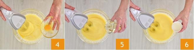 Warten Sie, bis sie gut eingearbeitet sind, bevor Sie das nächste hinzufügen 4. Mit dem Mixer in Aktion geben Sie nach und nach das Sonnenblumenöl 5 und die Milch 6 hinzu.