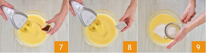 Fügen Sie auch den Vanilleextrakt 7 und eine Prise Salz 8 hinzu und rühren Sie weiter für etwa 1 Minute. Sieben Sie das Backpulver hinzu 9, um eventuelle Klumpen zu entfernen.