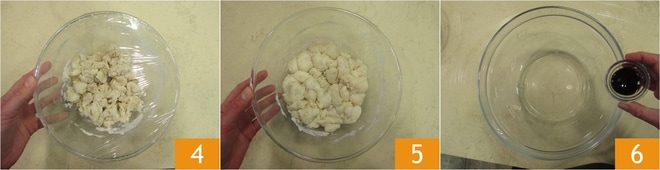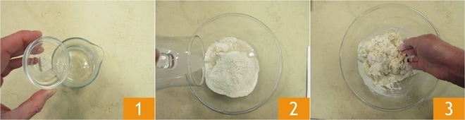 Um das Vollkornbrot zuzubereiten, beginnen Sie mit dem Vorteig. Gießen Sie das Wasser und die Hefe in einen Behälter 1. Rühren Sie, bis sie sich auflöst. Geben Sie nun das Mehl in eine Schüssel und fügen Sie die aufgelöste Hefe im Wasser hinzu 2. Kneten Sie schnell, bis das Mehl das Wasser aufgenommen hat 3.