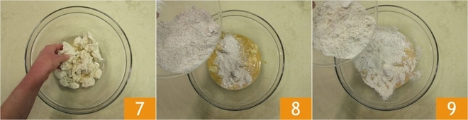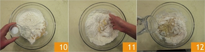 Fügen Sie das Salz hinzu 10 und beginnen Sie zu kneten 11. Sobald die Zutaten vermischt sind, fügen Sie nach und nach das Wasser hinzu 12.