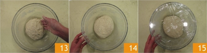 Wenn es anfängt homogen zu werden, kneten Sie weiter auf diese Weise: Heben Sie einen Teigstreifen an, bringen Sie ihn zur Mitte und fahren Sie auf diese Weise fort, indem Sie die Schüssel bei jeder Falte drehen. Wenn Sie einen glatten Teig erhalten haben, übertragen Sie ihn auf die Arbeitsfläche und geben Sie ihm mit einer Teigkarte Verstärkungsfalten. Sollte er zu klebrig sein, lassen Sie den Teig 5 Minuten ruhen, bevor Sie ihn weiter bearbeiten. Formen Sie ihn rund und geben Sie ihn erneut in die Schüssel 14, decken Sie ihn mit Frischhaltefolie ab 15 und lassen Sie ihn eine Stunde bei Raumtemperatur gehen. Dann stellen Sie ihn für 16 Stunden in den Kühlschrank.
