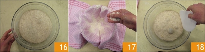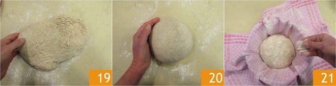 Breiten Sie den Teig aus 19, geben Sie ihm ein paar Falten, indem Sie die Enden zur Mitte bringen, und drehen Sie ihn dann um, sodass der Verschluss auf der Arbeitsfläche liegt. Formen Sie ihn rund, um die Form eines Laibs zu erhalten 20. Legen Sie ihn in den Korb, indem Sie den Teig umdrehen, sodass der Verschluss nach oben zeigt, und bestäuben Sie ihn mit mehr Mehl 21.