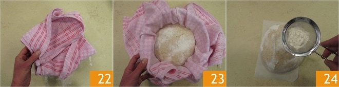 Schließen Sie das Tuch, um es abzudecken 22, und lassen Sie es weitere 3 Stunden bei Raumtemperatur gehen, bis der Teig den Rand der Schüssel erreicht hat 23. Drehen Sie dann den Laib auf ein Backpapier um und bestäuben Sie ihn erneut mit etwas Mehl 24.