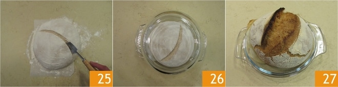 Schneiden Sie den Laib mit einem scharfen Messer ein 25 und legen Sie ihn in einen zuvor im Ofen auf 22 cm erhitzten Topf. Decken Sie ihn mit einem Deckel ab und backen Sie ihn 55 Minuten bei 250°C, wobei Sie den Deckel nach den ersten 30 Minuten entfernen. Nehmen Sie das Brot aus dem Ofen 27 und lassen Sie es vollständig abkühlen, bevor Sie es servieren.