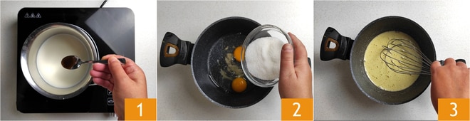 Um die Konditorcreme mit ganzen Eiern zuzubereiten, geben Sie zuerst die Milch in einen kleinen Topf und fügen das Vanilleextrakt hinzu 1. Erwärmen Sie die Milch bei niedriger Hitze, bis sie fast kocht. In der Zwischenzeit schlagen Sie in einem anderen Topf die Eier auf, geben den Zucker hinzu 2 und verrühren alles mit einem Schneebesen, bis die Mischung hell wird 3.