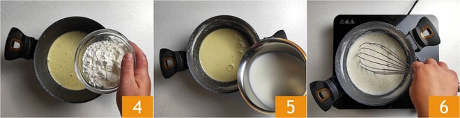 Fügen Sie die Maisstärke hinzu 4 und rühren Sie erneut, bis Sie eine cremige und klumpenfreie Masse erhalten. Nehmen Sie den Topf vom Herd und geben Sie nach und nach die Milch hinzu 5, während Sie kontinuierlich rühren. Sobald die gesamte Milch hinzugefügt wurde, stellen Sie den Topf bei niedriger Hitze zurück auf den Herd und rühren Sie weiter 6, während Sie die Mischung weitere 5 Minuten kochen.