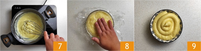 Wenn die Mischung eingedickt ist 7, geben Sie sie in eine Schüssel und decken sie mit Frischhaltefolie ab, sodass diese direkt auf der Creme aufliegt 8. Stellen Sie sie in den Kühlschrank und lassen Sie sie abkühlen. Ihre Konditorcreme mit ganzen Eiern ist bereit zum Verzehr 9.