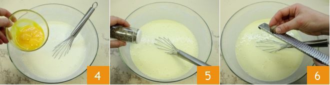 Trennen Sie die Eigelbe von den Eiweißen und geben Sie sie zur Mischung hinzu 4, fügen Sie nach Belieben Pfeffer 5 und geriebene Muskatnuss 6 hinzu.