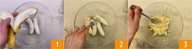 Um die Bananenwaffeln zuzubereiten, schälen Sie zuerst die Bananen 1 und geben Sie sie in eine Schüssel. Zerdrücken Sie sie mit einer Gabel 2, bis Sie ein Püree erhalten 3.