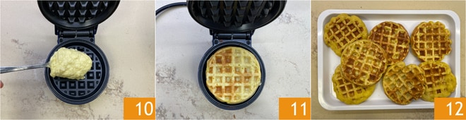 Nehmen Sie so viel Teig, wie nötig ist, um ein Fach des Waffeleisens zu füllen 10. Schließen Sie das Eisen und backen Sie es für etwa 2-3 Minuten 11. Verfahren Sie so, um alle Waffeln zu backen; mit diesen Mengen sollten Sie 7 erhalten 12.