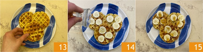 Richten Sie die Waffeln an 13 und garnieren Sie sie mit Bananenscheiben und Ahornsirup 14. Die Bananenwaffeln sind bereit, genossen zu werden 15!