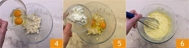 Fügen Sie die Eier 4 und den griechischen Joghurt 5 hinzu und mischen Sie alles 6.