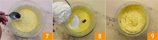 Geben Sie den Vanilleextrakt 7, das Backpulver und das Reismehl 8 dazu. Mischen Sie, bis Sie einen homogenen Teig erhalten 9.