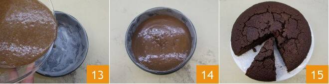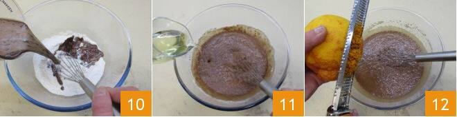 Wenn die Schokoladen-Zucker-Mischung abgekühlt ist, geben Sie sie in drei Schritten in die Schüssel mit dem Mehl 10 und rühren kräftig mit dem Schneebesen um, um Klumpenbildung zu vermeiden und eine homogene Mischung zu erhalten. Fügen Sie dann das Öl in einem dünnen Strahl hinzu 11 und, sobald es eingearbeitet ist, reiben Sie die Schale einer Orange hinein 12.
