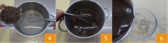 Um den Wasser-Schokoladenkuchen zuzubereiten, beginnen Sie damit, die Schokolade fein zu hacken 1. Legen Sie dann die Schokoladensplitter in eine kleine Schüssel und stellen Sie sie beiseite. Nehmen Sie nun einen Topf mit hohem Rand und geben Sie das Wasser hinein. Erhitzen Sie es bei schwacher Hitze. Wenn das Wasser warm wird, fügen Sie den Zucker hinzu 2 und rühren Sie mit einem Schneebesen gut um, um den Zucker aufzulösen 3.