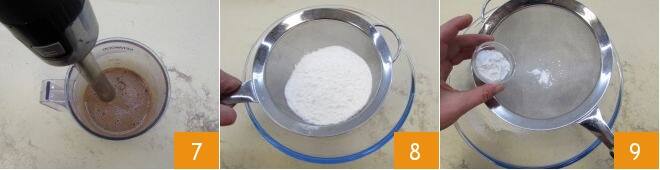 Nehmen Sie an diesem Punkt einen Stabmixer und pürieren Sie alle Zutaten in der Schüssel fein 7. Lassen Sie sie dann auf Zimmertemperatur abkühlen. Danach nehmen Sie eine Schüssel und sieben das Mehl 8 und das Backpulver 9.
