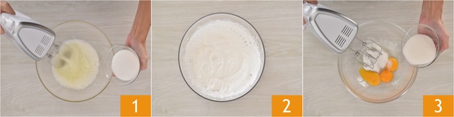 Um den Wasserkakao-Gugelhupf zuzubereiten, trennen Sie zuerst die Eigelbe von den Eiweißen. Schlagen Sie das Eiweiß steif, indem Sie die Hälfte des Zuckers hinzufügen 1, und stellen Sie es beiseite 2. Schlagen Sie die Eigelbe mit dem restlichen Zucker 3, bis die Masse hell und schaumig ist.