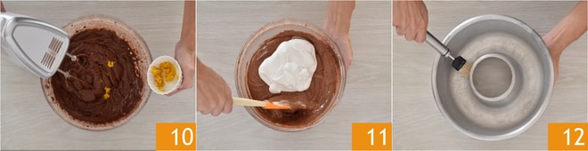 Aromatisieren Sie den Teig mit der abgeriebenen Schale der Orange 10. Fügen Sie schließlich den steif geschlagenen Eischnee hinzu, zuerst ein paar Löffel, um die Masse zu lockern, dann den Rest vorsichtig mit einem Spatel von unten nach oben unterheben. Fetten 12 und mehlen Sie eine Gugelhupfform mit einem Durchmesser von 24 cm.
