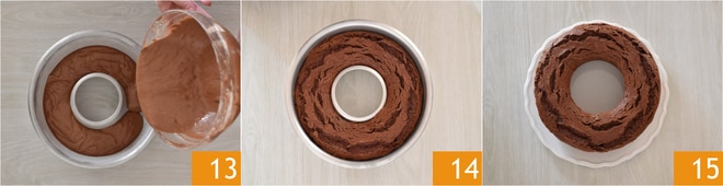 Gießen Sie den Teig hinein 13 und backen Sie ihn im vorgeheizten statischen Ofen bei 170° für 45-50 Minuten im unteren Bereich des Ofens. Sobald der Gugelhupf gebacken ist, nehmen Sie ihn aus dem Ofen 14, lassen Sie ihn vollständig auskühlen und nehmen Sie ihn aus der Form 15. Der Wasserkakao-Gugelhupf ist fertig, servieren Sie ihn mit einer Prise Puderzucker.