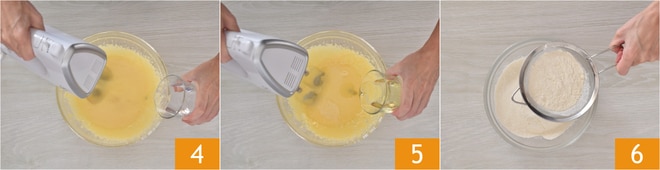 Fügen Sie das Wasser 4 hinzu und dann das Öl in einem dünnen Strahl 5, und verarbeiten Sie den Teig für einige Sekunden. In einer Schüssel Mehl und Backpulver sieben 6.