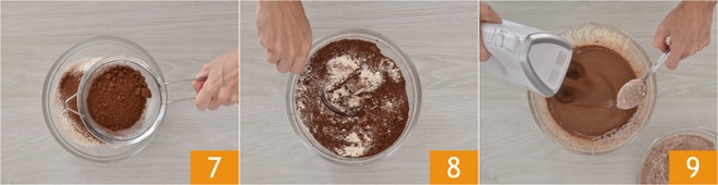 Fügen Sie auch das Kakaopulver 7 hinzu und mischen Sie 8. Fügen Sie die trockenen Zutaten nach und nach zur Eigelbmasse hinzu 9.