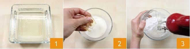 Um die Wassermelonen- und Joghurtgläschen zuzubereiten, beginnen Sie damit, die beiden Gelatinemengen in 2 verschiedene Schüsseln mit kaltem Wasser für etwa 10 Minuten einzuweichen 1. Nach dieser Zeit erwärmen Sie zwei Esslöffel Sahne aus der angegebenen Menge in einem Topf für etwa 1 Minute oder in der Mikrowelle auf höchster Stufe für einige Sekunden. Sobald die zwei Esslöffel Sahne erwärmt sind, lösen Sie eine Menge der ausgedrückten Gelatine darin auf 2 und rühren Sie gut um. Gießen Sie den Rest der Sahne in eine Schüssel und schlagen Sie sie mit dem Puderzucker auf 3, finden Sie heraus, wie Sie diese Aufgabe am besten meistern, indem Sie die Kochschule konsultieren: Wie man Sahne aufschlägt.