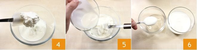 Fügen Sie den geschlagenen Rahm zum Joghurt hinzu 4 und geben Sie dann auch die mittlerweile abgekühlte Gelatine-Sahne-Mischung hinzu 5. Nachdem Sie die Mischung vermengt haben, verteilen Sie 1/4 davon in jedem Gläschen und glätten Sie sie gut. Stellen Sie sie für 30 Minuten in den Kühlschrank, um fest zu werden 6. Halten Sie den restlichen Joghurt bei Raumtemperatur.