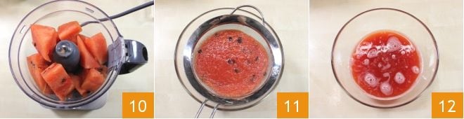 Geben Sie die Würfel in einen Mixer 10 und pürieren Sie sie, bis Sie ein Püree erhalten, das Sie mit einem Sieb in eine Schüssel filtern, um die Samen zu entfernen 11. Nehmen Sie 2 Esslöffel Wassermelonenpüree und geben Sie sie in eine kleine Schale 12.
