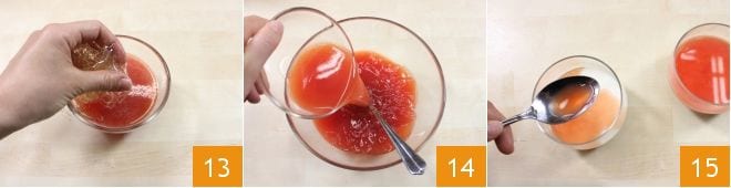 Erwärmen Sie die 2 Esslöffel Wassermelonenpüree in einem Topf für 1 Minute oder in der Mikrowelle auf höchster Stufe für einige Sekunden, drücken Sie dann das andere in kaltem Wasser eingeweichte Gelatineblatt aus und lösen Sie es in den 2 Esslöffeln Wassermelonenpüree auf 13. Nachdem Sie die Mischung verrührt haben, geben Sie sie zum restlichen Wassermelonenpüree 14. Nach 30 Minuten nehmen Sie die Gläschen mit der ersten Joghurt-Schicht aus dem Kühlschrank, die mittlerweile fest sein wird, und gießen Sie die Wassermelonengelatine darüber, wobei Sie eine Schicht von der gleichen Dicke wie die Joghurt-Schichten schaffen 15. Stellen Sie die Gläschen erneut für 30 Minuten in den Kühlschrank und lassen Sie den restlichen Teil bei Raumtemperatur.