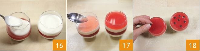 Nach dieser Zeit formen Sie eine weitere Schicht Joghurtcreme 16, lassen Sie sie weitere 30 Minuten im Kühlschrank fest werden und beenden Sie das Ganze mit einer Schicht Wassermelonengelatine 17. Lassen Sie sie noch mindestens weitere 30 Minuten fest werden und dekorieren Sie die letzte Schicht schließlich mit Schokotropfen, als wären es Wassermelonensamen 18. Servieren Sie Ihre Wassermelonen- und Joghurtgläschen und genießen Sie jede Schicht!
